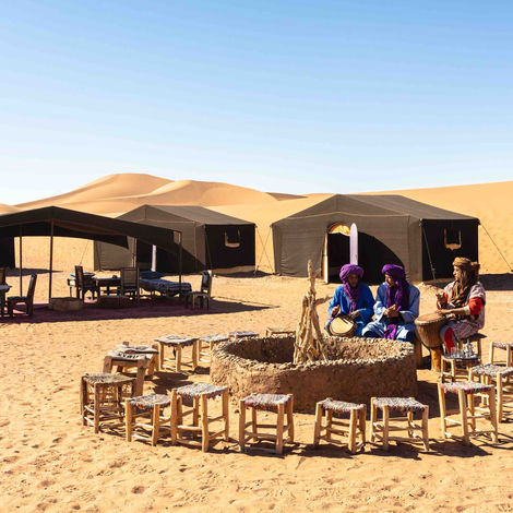After breakfast, we will continue our journey South, crossing many berber and saharian villages, the area can already be considered a desert for most people, but were just getting started. We will stop at Tamegrout if you are interested in seeing the pottery industry. Arriving at Mhamid El Ghizlan announces the end of the Asphalt and the beginning of the real wilderness where only experienced drivers dare to go, rocky and rough terrain and sandy routes then small dunes then medium dunes for about 50 km before we reach the camp site...!! Once there, you can enjoy your camel ride to witness a majestic sunset and the true meaning of freedom in that vast golden world. And Even in this middle of nowhere, you can still rest, take a shower, have some mint tea and enjoy the moment, dinner will be served at the camp's restaurant and musical plays are held around fire.